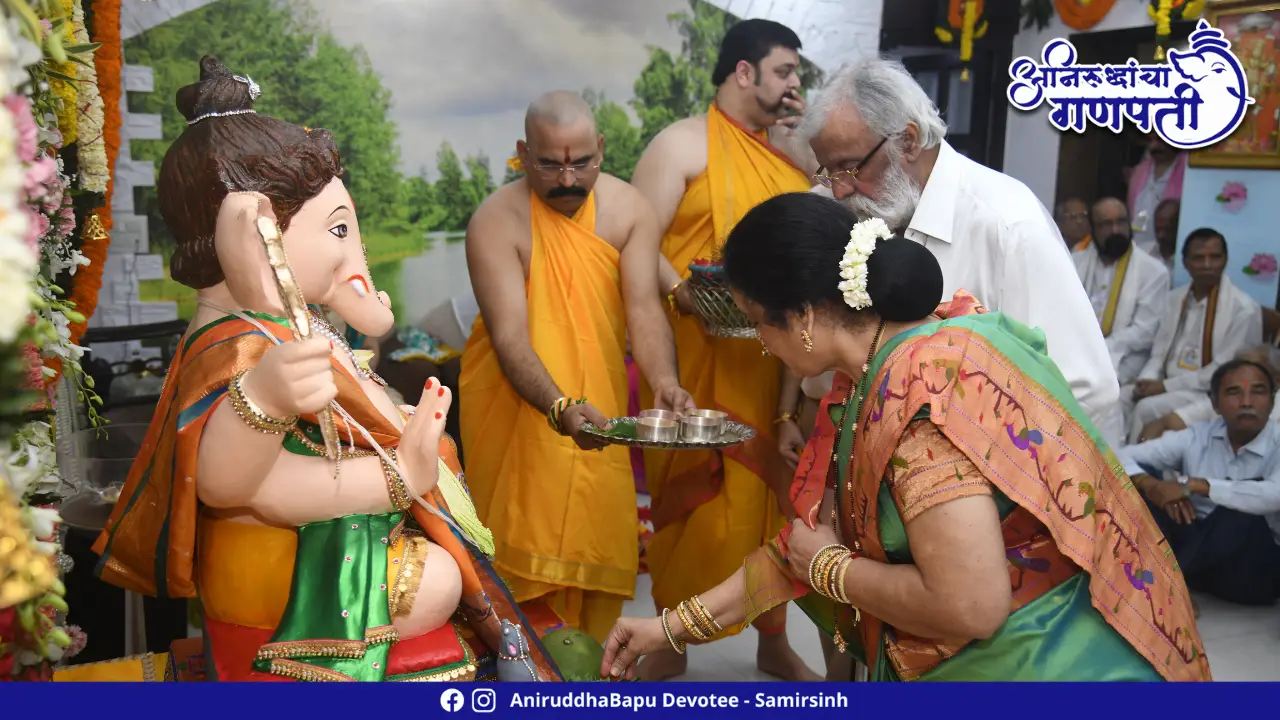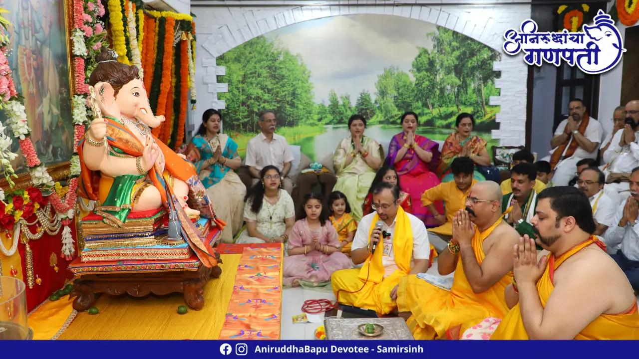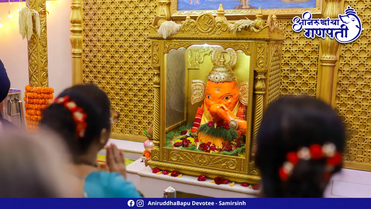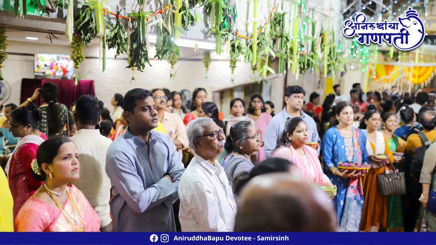 Shraddhavans collectively participated in the Dhol Tasha Pathak, alongside Lezim & Dhwaj, and celebrated the arrival of Shree Ganpati Bappa. In the procession, several other Shraddhavan devotees joined to welcome our beloved Bappa to Sadguru Shree Aniruddha's residence. Moreover, the enthusiasm of the procession rose when beloved Sadguru Shree Aniruddha himself came to welcome Ganpati Bappa at the gate of Shree Datta Niwas, and danced to the beats of Dhol and Tasha with the Shraddhavans in that grand procession! The arrival of Ganesh Utsav at Sadguru’s residence, Shree Datta Niwas, is a golden opportunity that Shraddhavans eagerly await each year. With a grand procession, the divinely adorned Ganpati Bappa is welcomed amidst devotion and joy. From early morning, Shraddhavans patiently stand in long queues, filled with love, to behold the serene Darshan of Ganpati Bappa. This year, devotees also chanted the Shree Ganpati Atharvashirsha and Shree Moolark Ganpati Mantra on their way to Shree Aniruddha Gurukshetram, where they received the blessings of both Swayambhu Ganesh and Shree Moolark Ganpati. At Sadguru’s home, devotees offered the sacred Sankalp Supari, placing their vows and heartfelt prayers at Bappa’s feet. Blessed by the serene Darshan of Shree Ganesh and the ever-loving grace of their Sadguru, Shraddhavans departed with hearts overflowing with bliss and divine contentment.