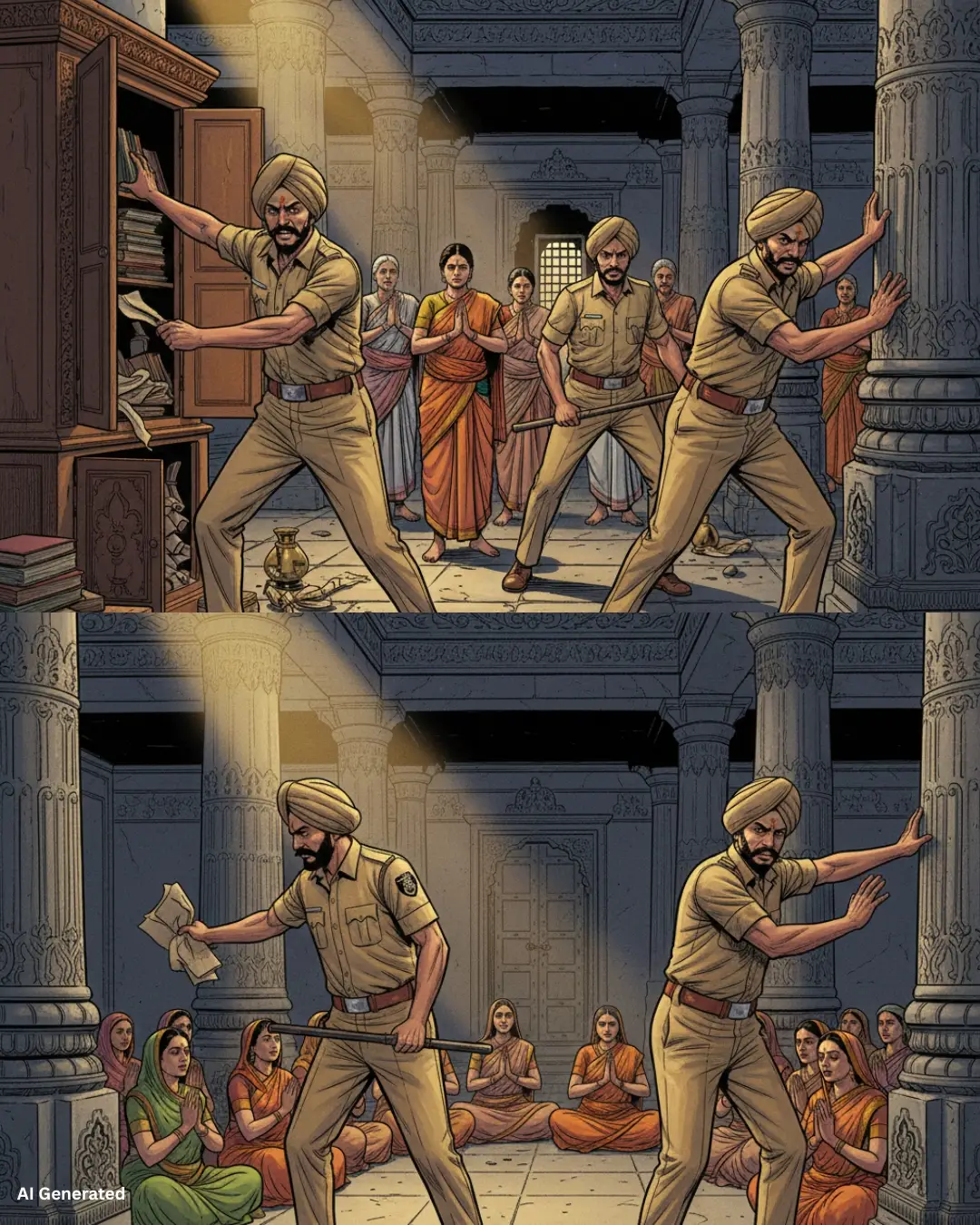 On arriving in the premises of the temple, Heldon sat outside in the yard and obeying his orders, these four officers began scrutinizing the temple and the assembly hall. But then they were required to follow certain rules, viz. rules regarding non-violation of the sanctity of the temple. However, realizing that abiding by the rules was not getting them anywhere, these four officers chose to disregard those rules and forced their way into certain areas to examine every corner and every cupboard.