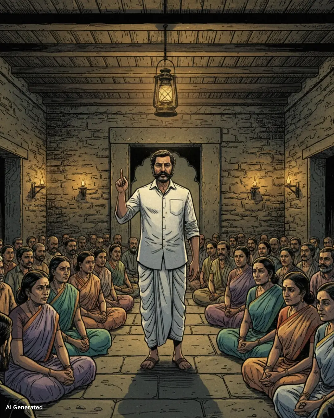 पुढच्याच रांगेत बसलेला ‘संपतराव’ नावाचा पंचविशीतला तडफदार तरुण उभे राहून म्हणाला, “एवढ्या सगळ्या सोयी ब्रिटीश सरकारने आपल्याला दिलेल्या असताना आपण त्यांच्याशी कृतघ्न का व्हायचे? त्यांनी आपल्याशी प्रतारणा केली आहे का?”