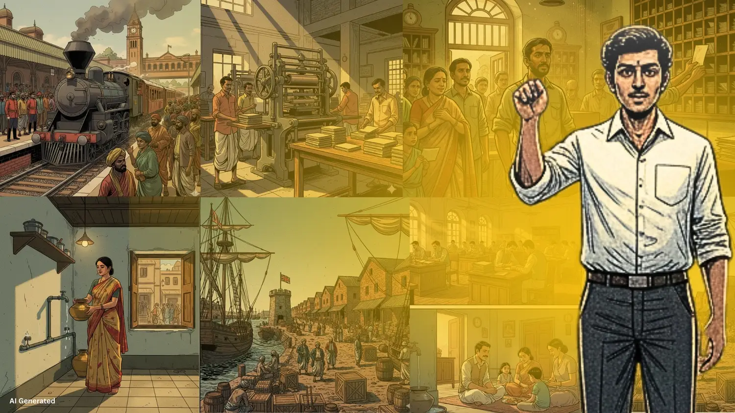 सर्वांचे समाधान नीट झालेले पाहून मल्हारराव पुढे बोलू लागले, “पहिल्यांदा ब्रिटीश सरकार भारतावर राज्य करतच नव्हते. भारतावर राज्य करत होती, ती ब्रिटिशांची एक व्यापारी कंपनी - ईस्ट इंडिया कंपनी. ह्या ईस्ट इंडिया कंपनीने प्रथम कलकत्ता, सूरत व अडगळीत पडलेली मुंबईची सात बेटे येथे आपल्या वखारी, गोदामे व वसाहती निर्माण केल्या आणि मग हळूहळू पद्धतशीररित्या भारतातील एक-एक राज्य घेण्यास सुरुवात केली.